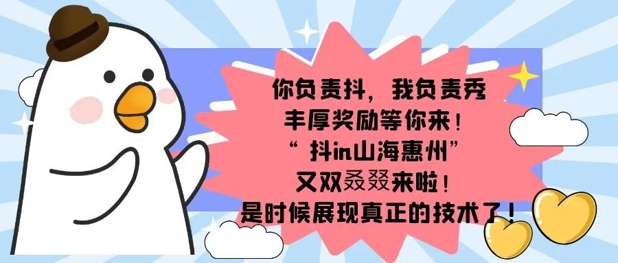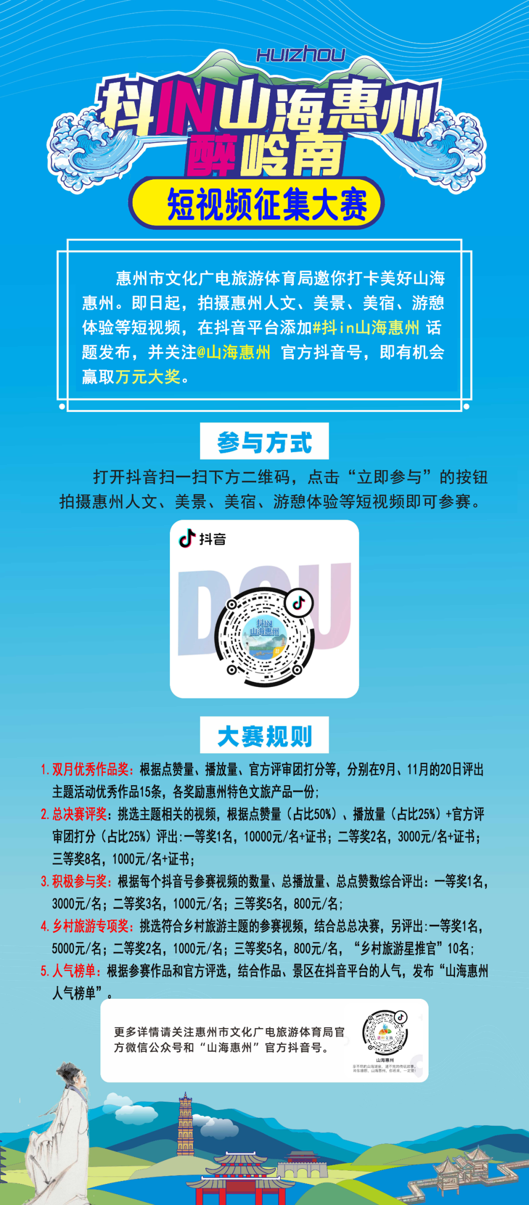 即日起,拍摄惠州人文、美景、美宿、游憩体验等短视频,在抖音平台添加#抖in山海惠州话题发布,并关注@山海惠州官方抖音号,即有机会赢取万元大奖。