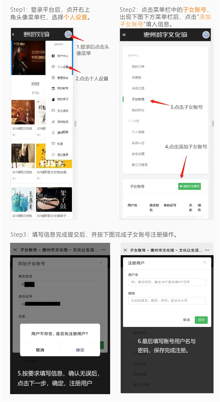 因报名系统升级,暑期班课程须在“惠州数字文化馆”平台添加子女账号后,方能参与报名。新用户要先注册平台账号哦。操作如下: