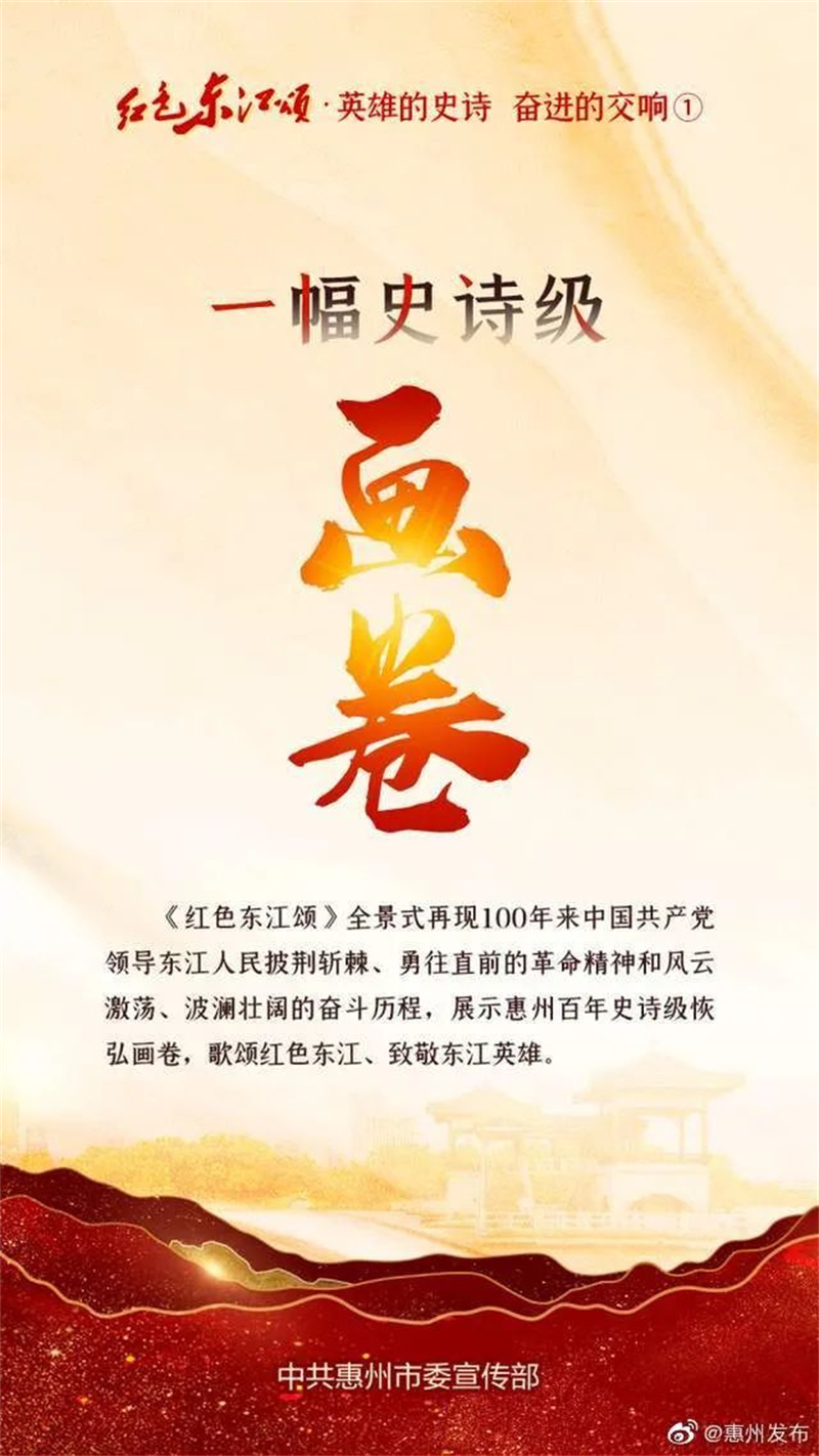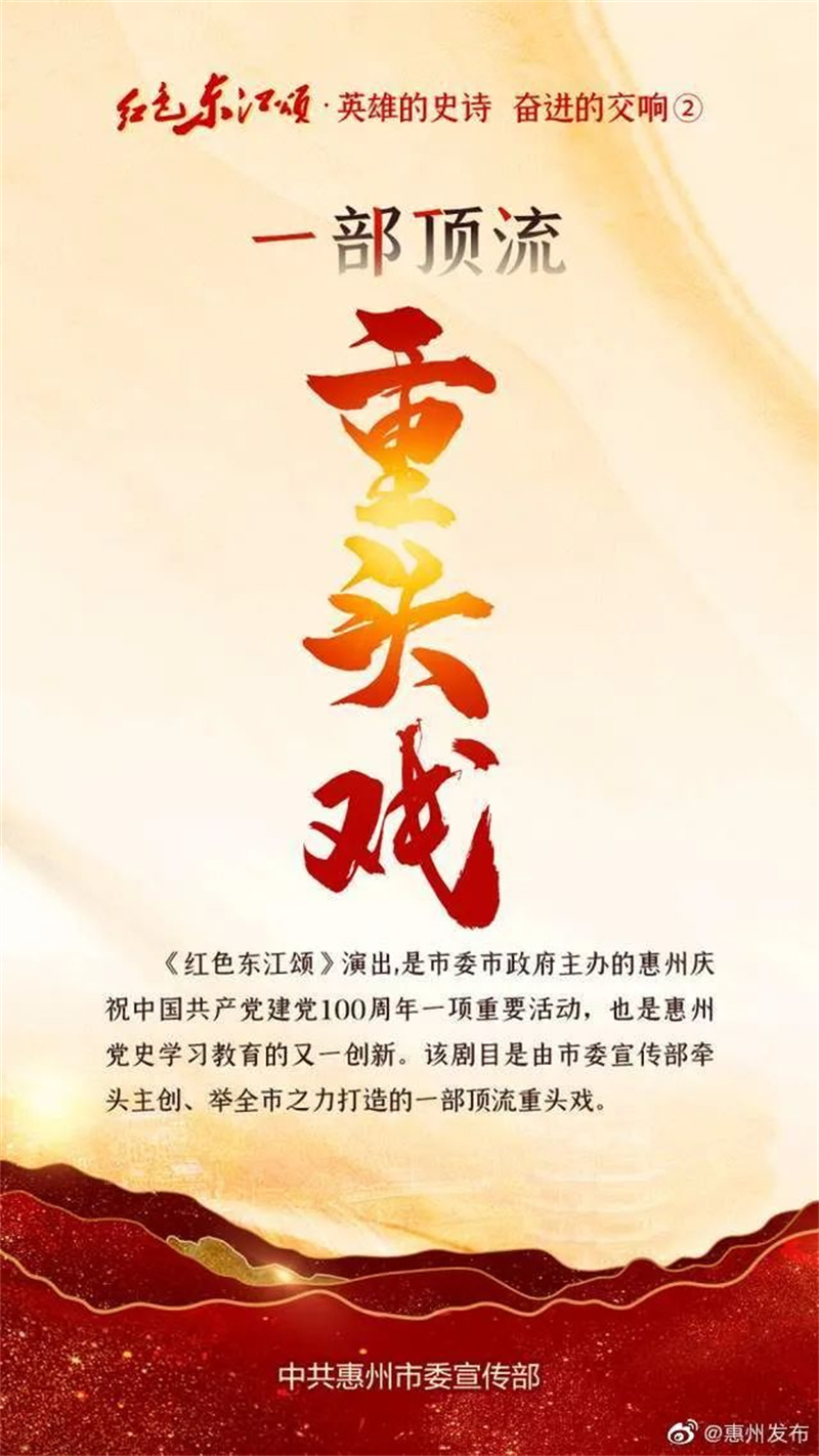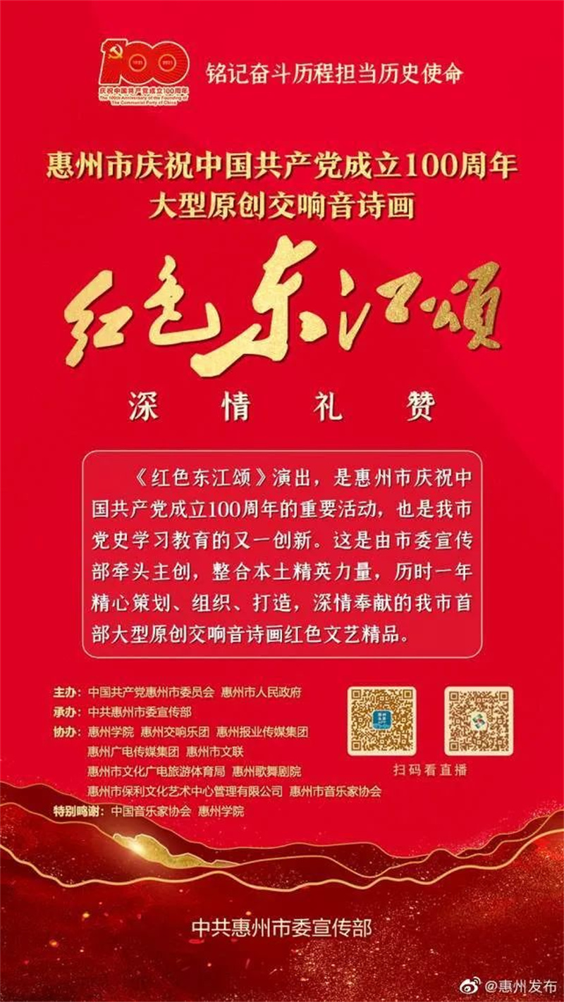 据了解,大型原创交响音诗画《红色东江颂》主题文艺演出,是我市庆祝中国共产党建党100周年重要活动之一,也是我市党史学习教育的创新形式之一。《红色东江颂》由市委宣传部牵头主创,以本土文化文艺力量为主,以文艺形式讴歌党领导惠州人民革命、建设、改革、新时代新征程奋斗史发展史,通过“描述历史,聚焦新征程”,表达惠州人民“不忘初心跟党走”的热切心声及对党百年华诞的深情祝福,凝聚新时代全市上下建设更加幸福国内一流城市的磅礴力量。