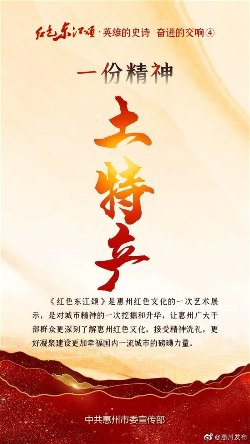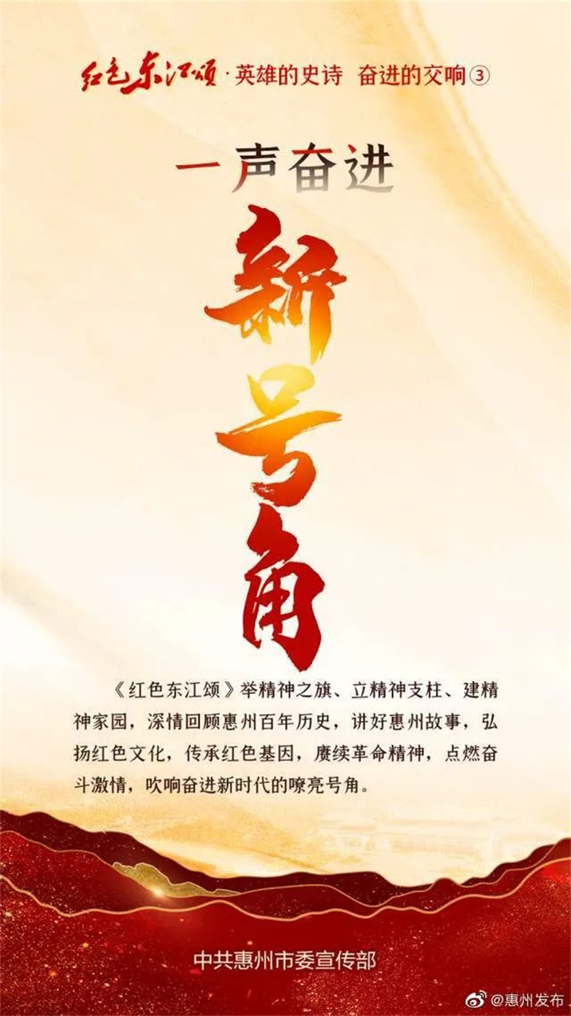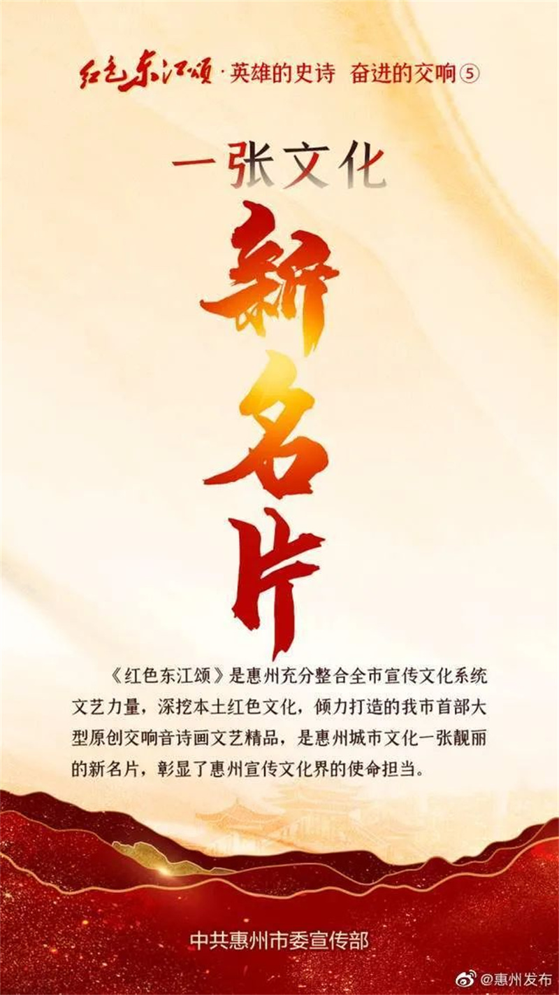 据了解,大型原创交响音诗画《红色东江颂》主题文艺演出,是我市庆祝中国共产党建党100周年重要活动之一,也是我市党史学习教育的创新形式之一。《红色东江颂》由市委宣传部牵头主创,以本土文化文艺力量为主,以文艺形式讴歌党领导惠州人民革命、建设、改革、新时代新征程奋斗史发展史,通过“描述历史,聚焦新征程”,表达惠州人民“不忘初心跟党走”的热切心声及对党百年华诞的深情祝福,凝聚新时代全市上下建设更加幸福国内一流城市的磅礴力量。