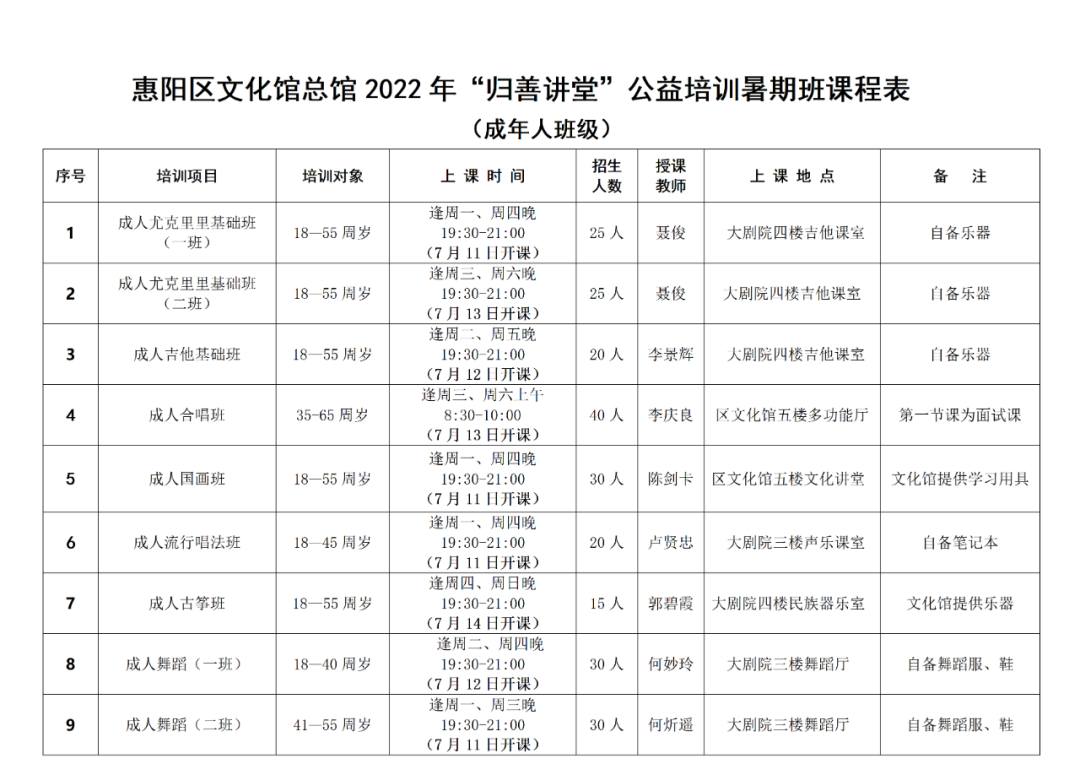 来了来了,惠阳区文化馆2022年“归善学堂”公益培训暑假班即将开始报名!所有课程免费向市民开放。赶紧调好闹钟冲啊!!
