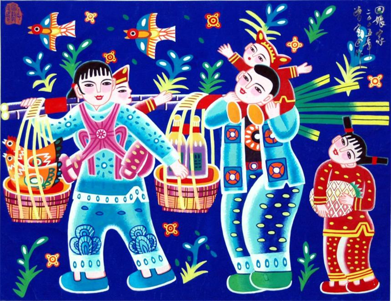 这幅作品描绘了外嫁女在节日里和家人一同回自己娘家探亲的场景。该作品于1992年荣获中国农民画优秀作品展优秀奖。