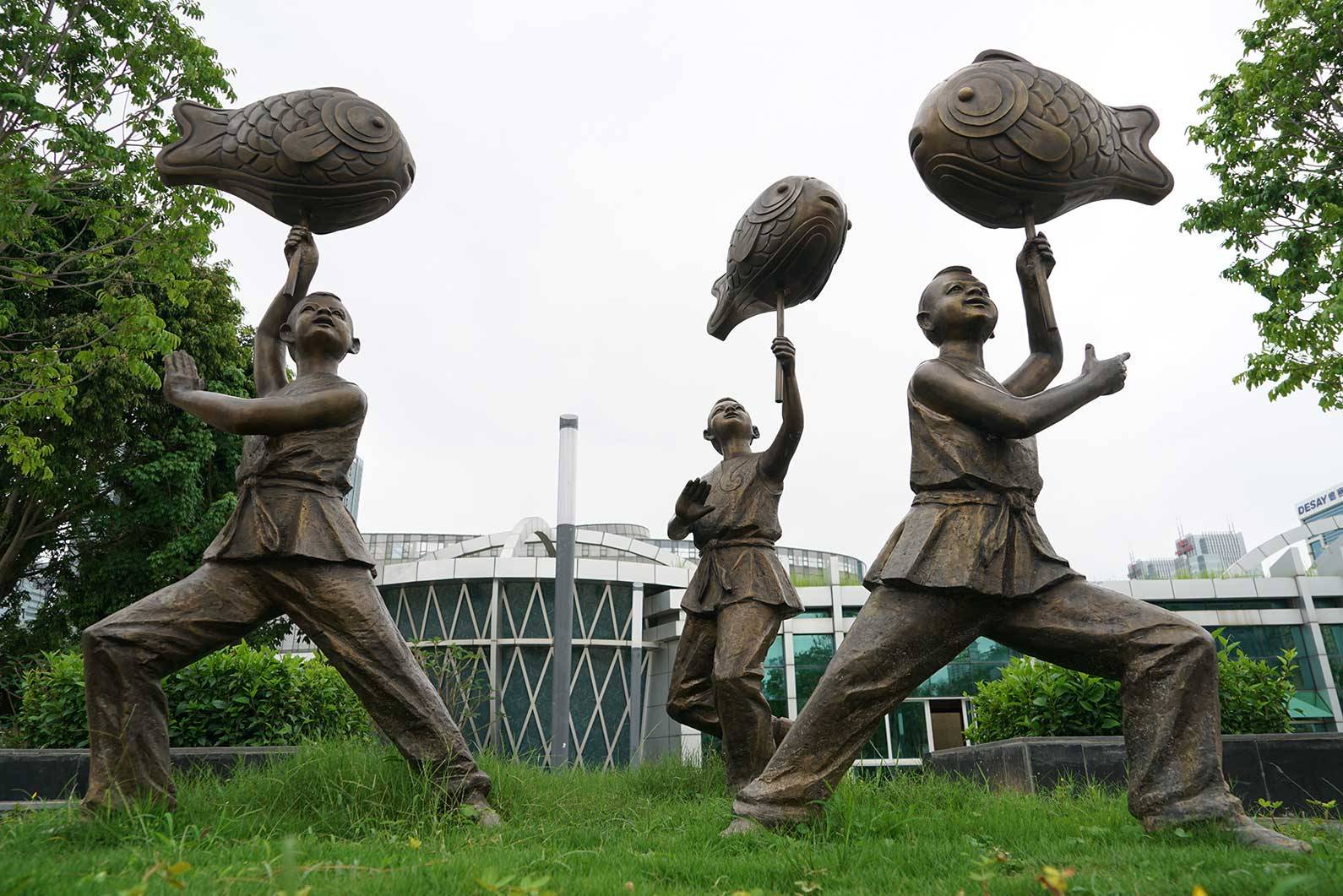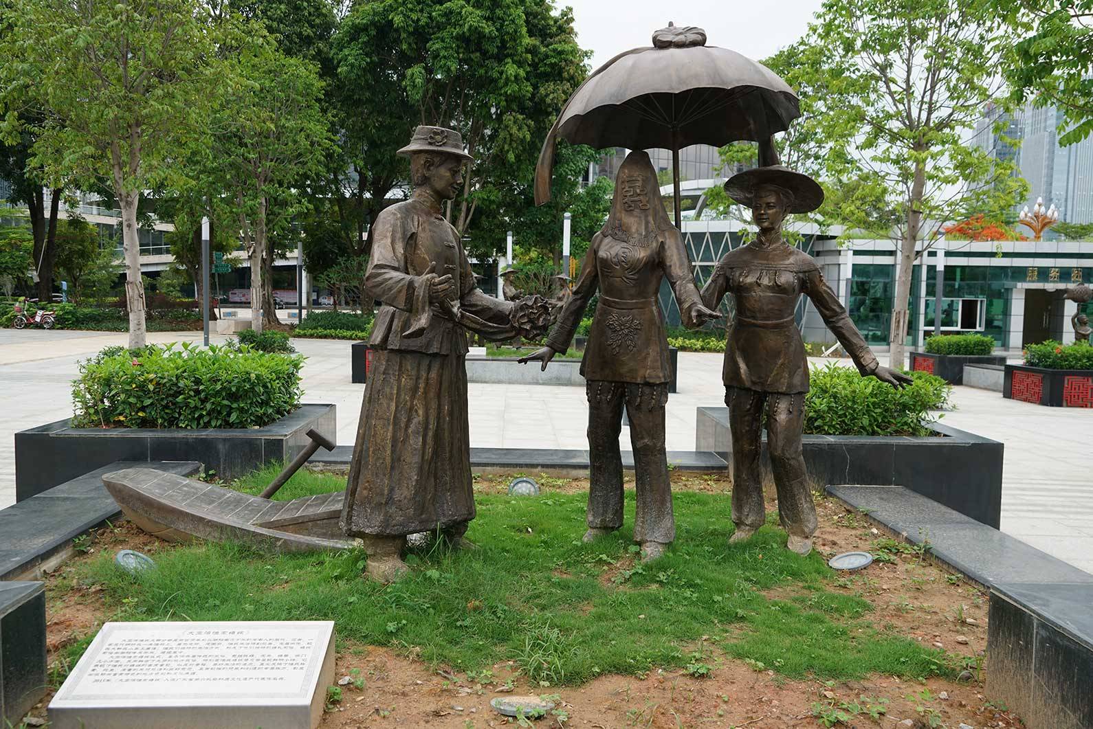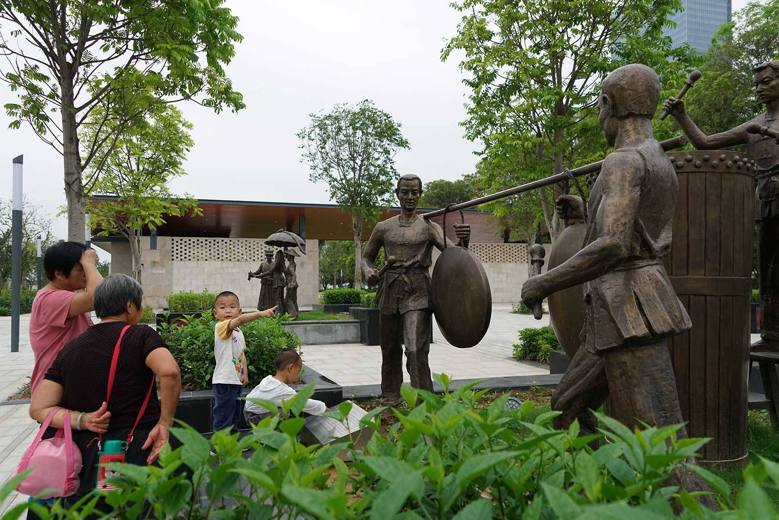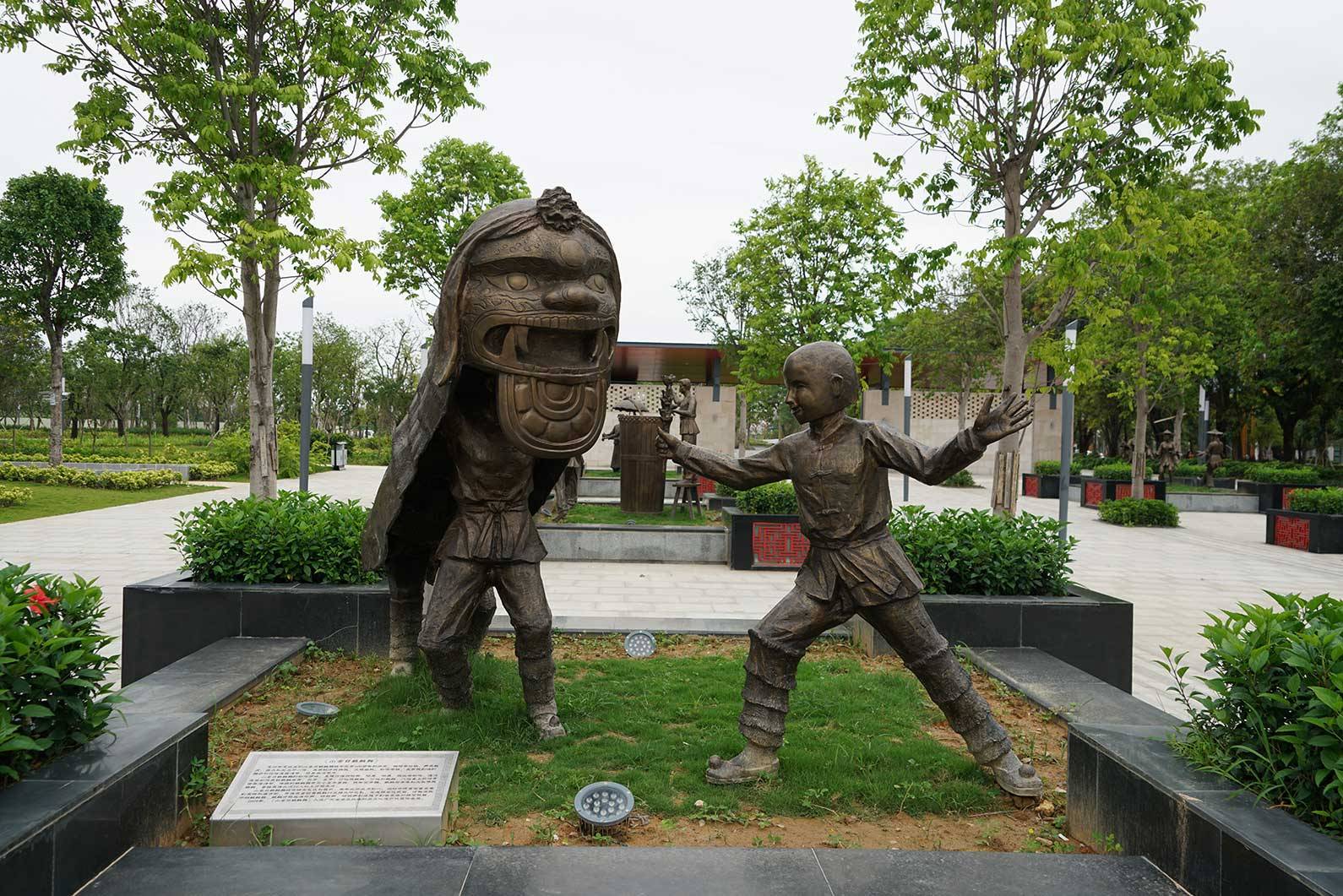 顺着雕塑园往竹林的方向走去,就会看到“民俗园”的指示牌。民俗园有秩地摆放着六座铜像,生动而又形象地展示着惠州各区域的特色民俗。