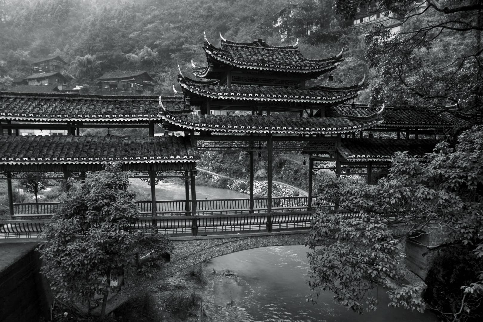 次日清晨六点,绝大多数游客由于来时奔波劳累还沉睡于梦乡之中。我们一行人已匆匆上路,此时的白水河两岸的吊脚苗寨与风雨廊桥在清晨柔和的阳光沐浴下变得光影迷人,美妙灵动。天空中云层变化多端,阳光时隐时现,形成了少许的区域光以及人们常说的耶稣光芒,当我们乘观光车上到山顶,俯瞰山下,千户苗寨层层叠叠连绵成片,这种背靠青山,山脚下一水环流的美景真可谓气势恢宏,蔚为壮观。由于时间的关系,山顶观景台不宜久留,徒步下山,边走边看。沿着来路直下山脚,沿途白水河上的风雨廊桥与周边吊脚苗寨的光影组合美不胜收。这里的风雨廊桥是典型的苗、侗民族的风格。廊桥由桥、塔、亭组合而成,桥两边设栏干、长木橙,桥顶盖瓦,檐角飞翘,形成长廊式走道,长廊与塔、亭建在河水中的石桥墩上,以防洪水冲毁。其功能多样,让人徒步行走、坐谈休闲、商贩集市、遮阳避雨,故称“风雨桥”。每一座廊桥都用苗语命名,都有着它的意义,都在讲述它的历史,伴随着潺潺流水声又有着别样的温婉故事与人间美意。