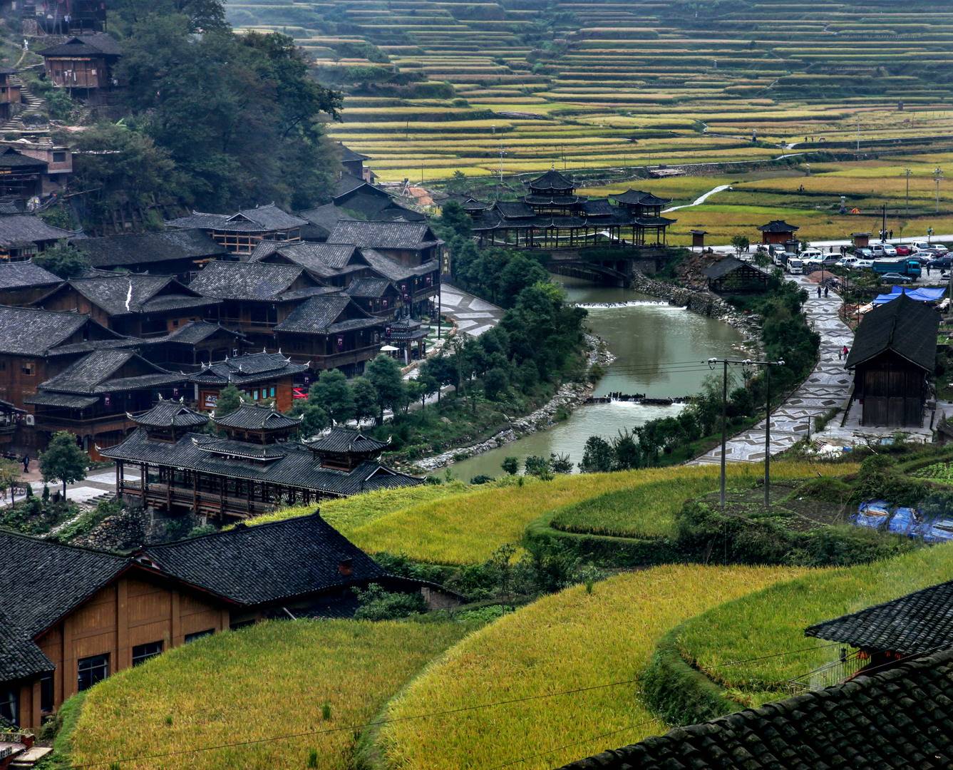 有谁会想到在云贵高原的东部黔东南雷公山麓的深处隐藏着中国最大的苗寨。这里居住着1300多户的苗族同胞;这里是中国历史上苗族五次大迁徙的聚居地;这里四面环山,层峦叠嶂,梯田依山顺势直连云天;这里的苗家吊脚楼层层叠叠,错落有致,风雨廊桥在白水河上依次排列,宛若一幅跌宕起伏的民族山水画卷;这里的山山水水浸润着苗族同胞的淳朴,勤劳和勇敢;这里的银饰苗服,芦笙歌舞及其遗风古俗在这里世代相传,被中外人类学家和民俗学者誉为保存苗族原始生态文化最完整的地方。这就是久负盛名的黔东南西江苗寨。