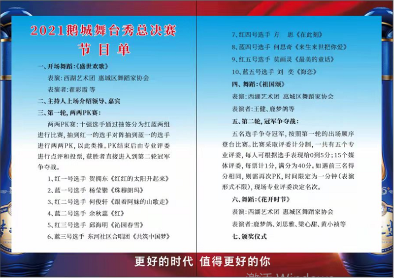 “鹅城舞台秀”第七季自7月份正式启动以来,历时四个多月,累计举办了15场网络视频海选、8场线下复赛和2场线下半决赛,参赛选手不仅有来自惠州各县区,还有广州、深圳、中山、河源省内的选手,甚至有省外的选手不远千里赶来参加比赛。八场复赛和两场半决赛观看网络直播的观众超过50万人次,再次证明了鹅城舞台秀的品牌效应。现拟于12月15日晚上举行“鹅城舞台秀”第七季年度总决赛.