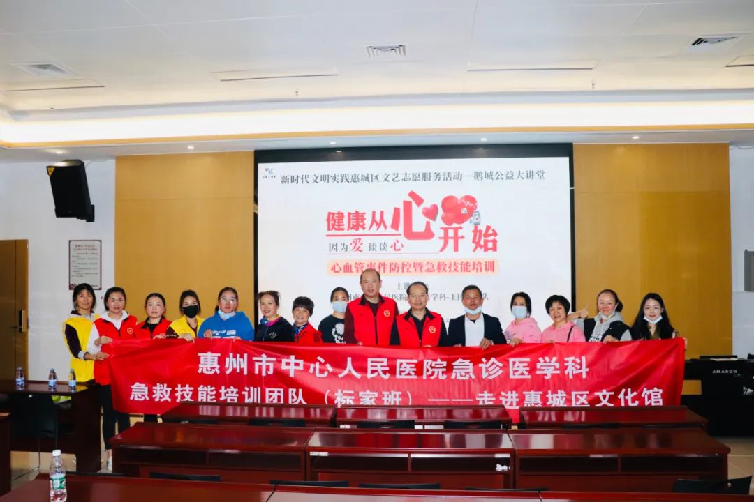2021年12月7日下午,由惠城区文化广电旅游体育局主办,惠城区文化馆总馆、惠城区文化馆文艺志愿服务队承办,惠州市中心人民医院急诊医学科协办的“鹅城公益大讲堂”系列活动之——《心血管事件防控暨急救技能培训》专题讲座在惠城区文化馆三楼大培训室举行。讲座邀请了惠州市中心人民医院急诊医学科王国标主任进行专题授课,与市民共同学习、探讨关于心血管急救防控技能。
