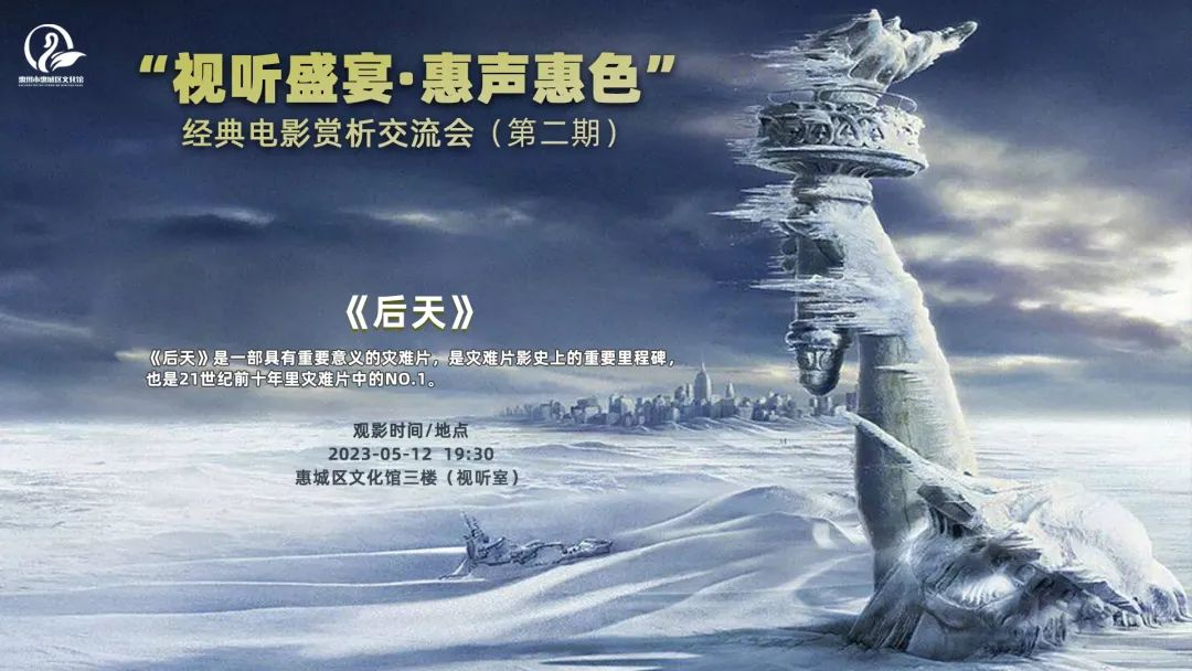 5月12日晚上19:30,惠州市惠城区文化馆举办了“视听盛宴•惠声惠色”第二期经典电影赏析交流会,本期欣赏影片《后天》使观众就自然生态问题展开热议。影片中环境恶劣的程度、灾害来临的速度、城市毀灭的范围都是不可控因素,观众的心情随着剧情走向不断跌宕起伏。