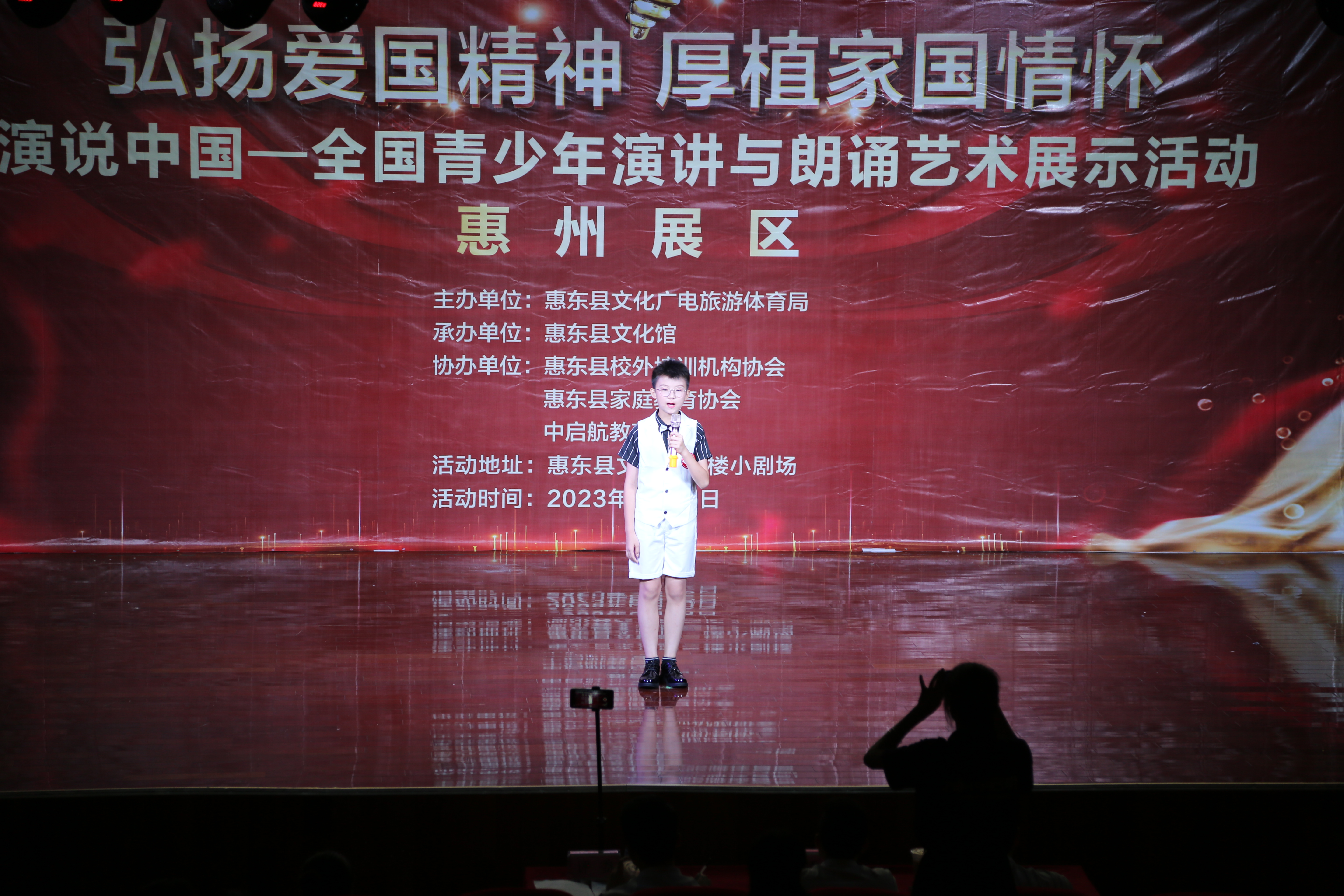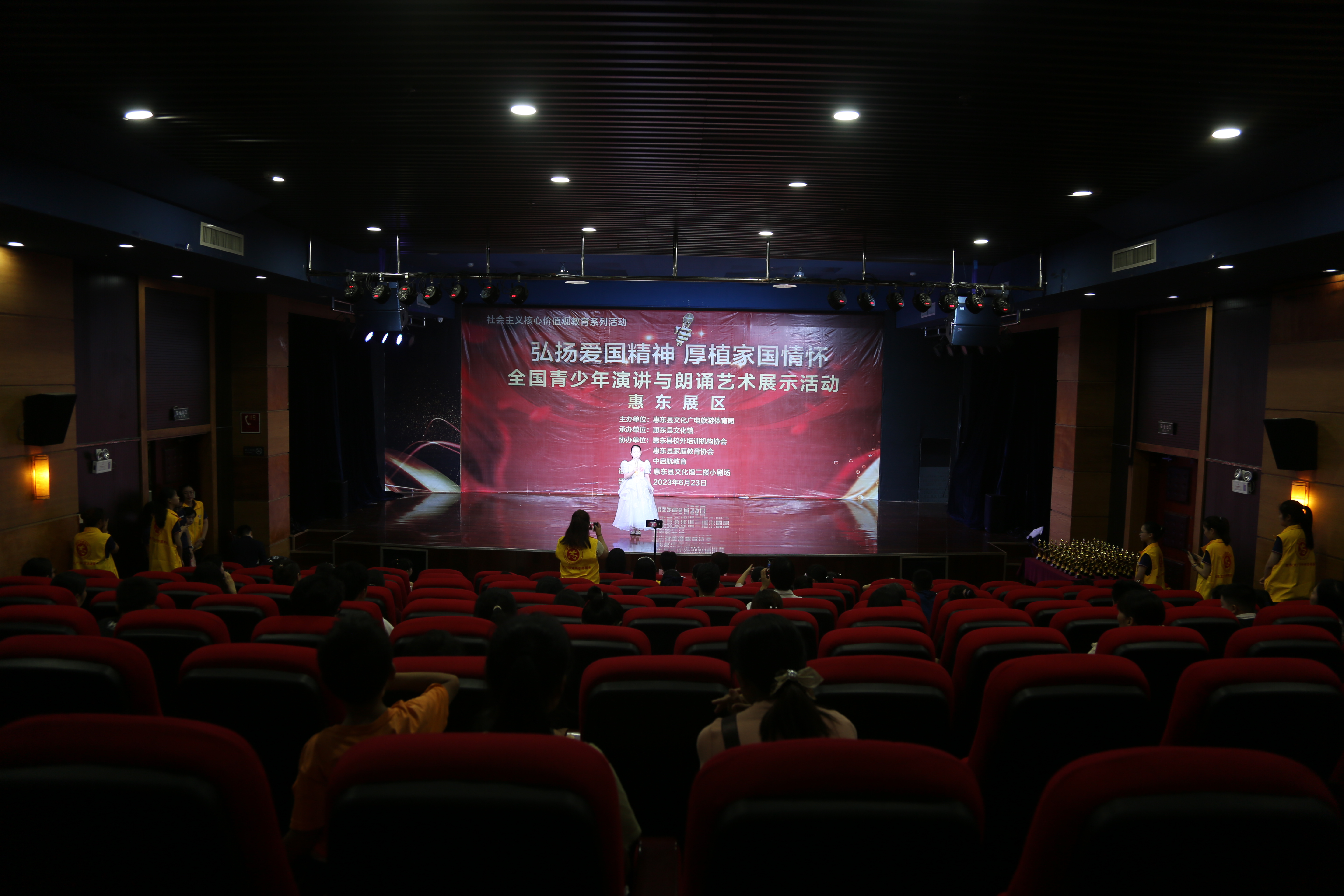 6月23日,由惠东县文化广电旅游体育局主办,惠东县文化馆承办,惠东县家庭协会协办的社会主义核心价值观教育系列活动——“弘扬爱国精神厚植家国情怀”全国青少年演讲与朗诵艺术展示活动在文化馆二楼小剧场举行。