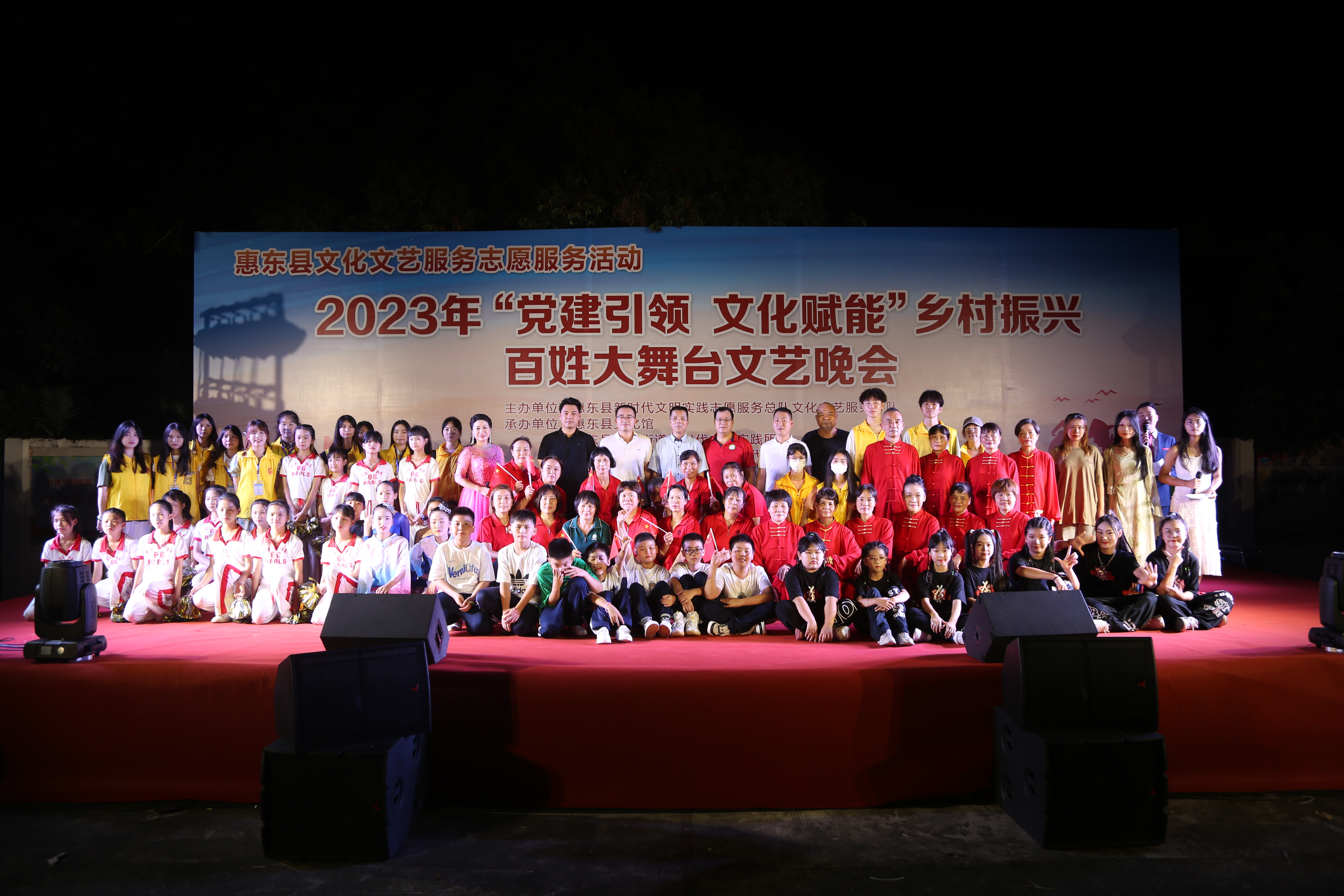 为全面贯彻党的二十大和习近平总书记视察广东重要讲话、重要指示精神,按照省委、省政府关于实施“百县千镇万村高质量发展工程”决定和乡村振兴战略工作部署,推动乡村全面振兴,建设绿美生态惠东,促进城乡区域协调发展,以文化振兴赋能乡村振兴,建设宜居宜业、和谐美丽的新时代乡村,2023年7月10日晚,由惠东县新时代文明实践志愿服务总队文化文艺服务分队主办,惠东县文化馆、惠东县平山街道新时代文明实践所、惠东县平山街道三联村委承办,广东金融学院三下乡惠农人小队协办的2023年“党建引领 文化赋能”乡村振兴百姓大舞台文艺晚会在惠东县平山街道三联村三联小学举行。