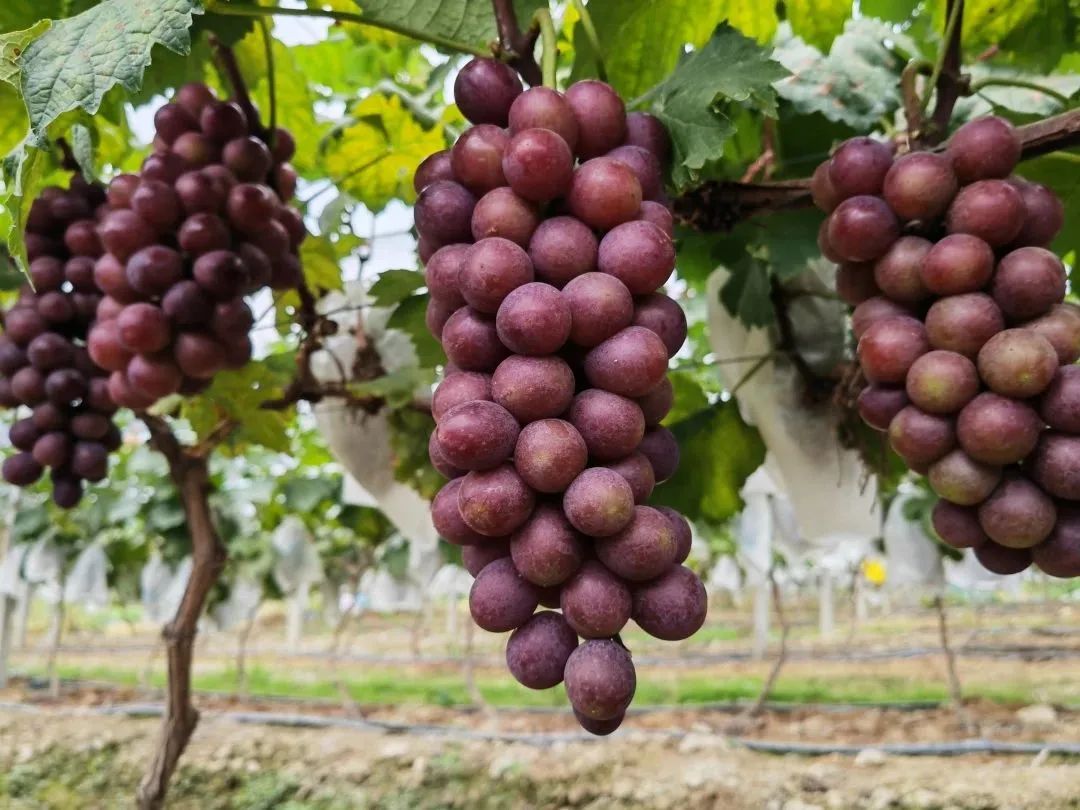 串串晶莹剔透、红得发紫的葡萄挂满枝头