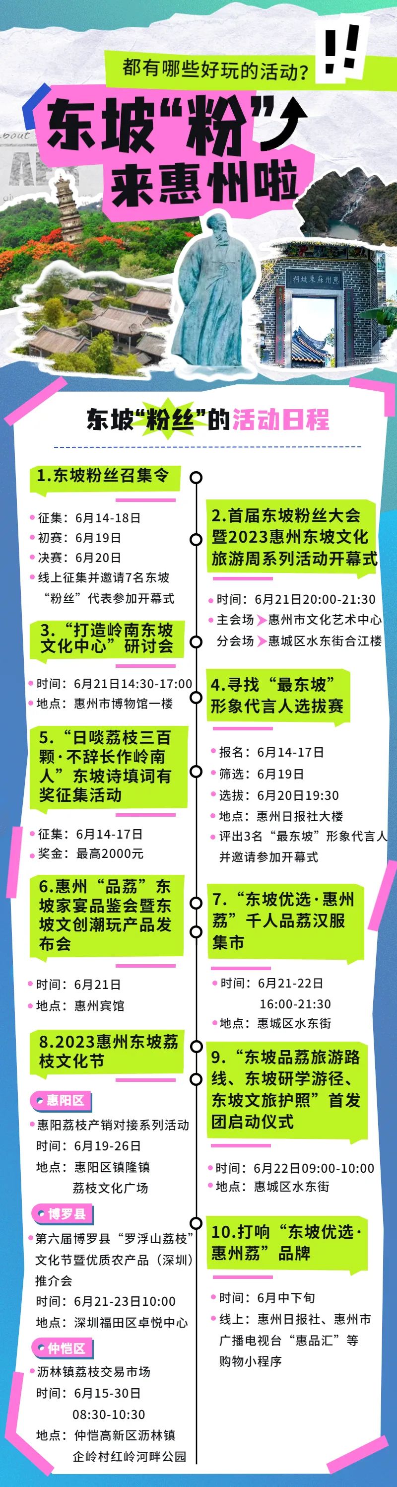 活动内容:线上发出粉丝召集令,分别召集东坡的诗词粉、吃货粉、笔墨粉、打卡粉、才情粉、乐天粉、琼浆粉等7类粉丝,以图文并茂的方式说出“粉”东坡的理由,并线上报名生成二维码参与召集。组委会将邀请7名粉丝代表前来惠州参加粉丝大会,品东坡荔枝、游东坡游线。