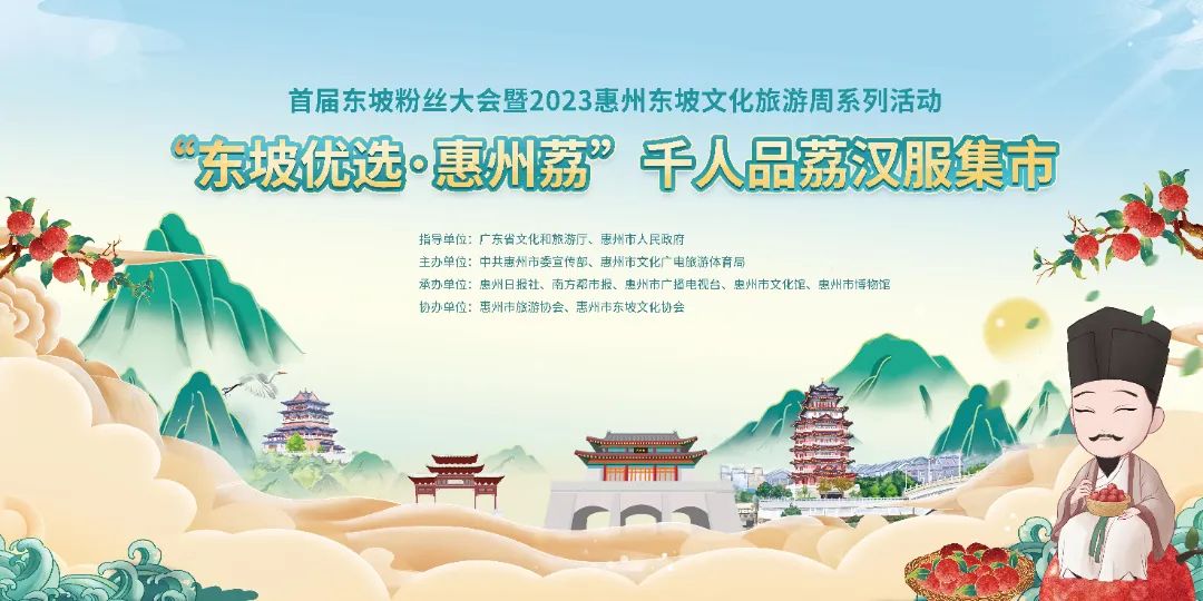活动内容:围绕“佳人相见一千年”主题,以东坡荔枝、东坡潮玩、东坡茶饮、文创雪糕为卖点,与惠州美食小吃相结合,举办“东坡优选·惠州荔”千人品荔汉服集市,通过设置网红打卡点、定点表演、汉服专业形象扮演互动等节目,吸引市民及游客参与。
