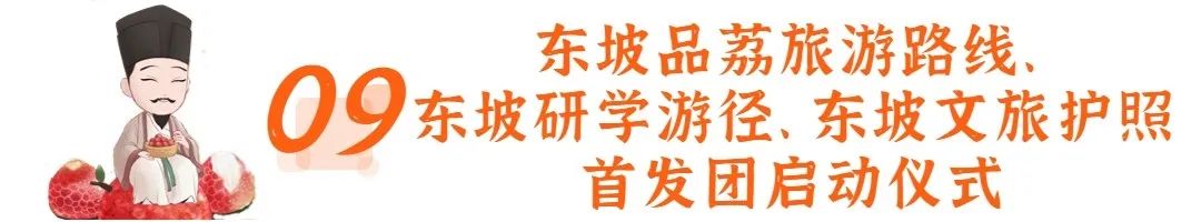 活动内容:组织媒体记者、网红达人、旅行社行业代表等人员参与首发仪式,公开发布东坡品荔旅游路线、“幸惠西湖”东坡研学游径、推出《东坡文旅护照》以及文旅消费补贴旅游路线,结合荔枝成熟季开展“万人品尝东坡荔枝”等活动。