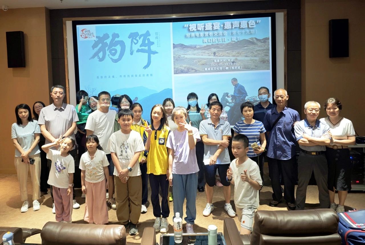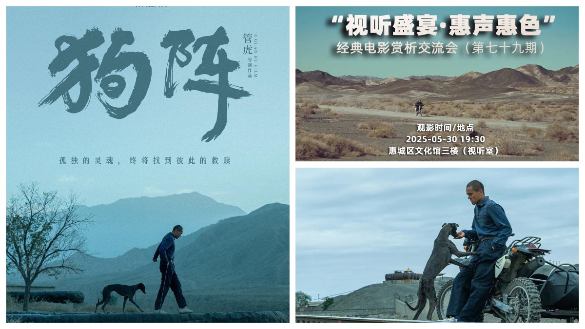 “视听盛宴•惠声惠色”经典电影赏析活动(第七十九期)放映影片《狗阵》,该片讲述了十余年前,西北小镇,刚出狱的二郎重归故土的故事。面对偏见,面对防备,二郎不知该如何开启新生活。迫于生计加入打狗队后,二郎拯救了一只黑色流浪细犬,而二郎也在和黑狗的相处中获得了再次上路的勇气。一人一狗在互相救赎中,拥抱着彼此的新生的故事。