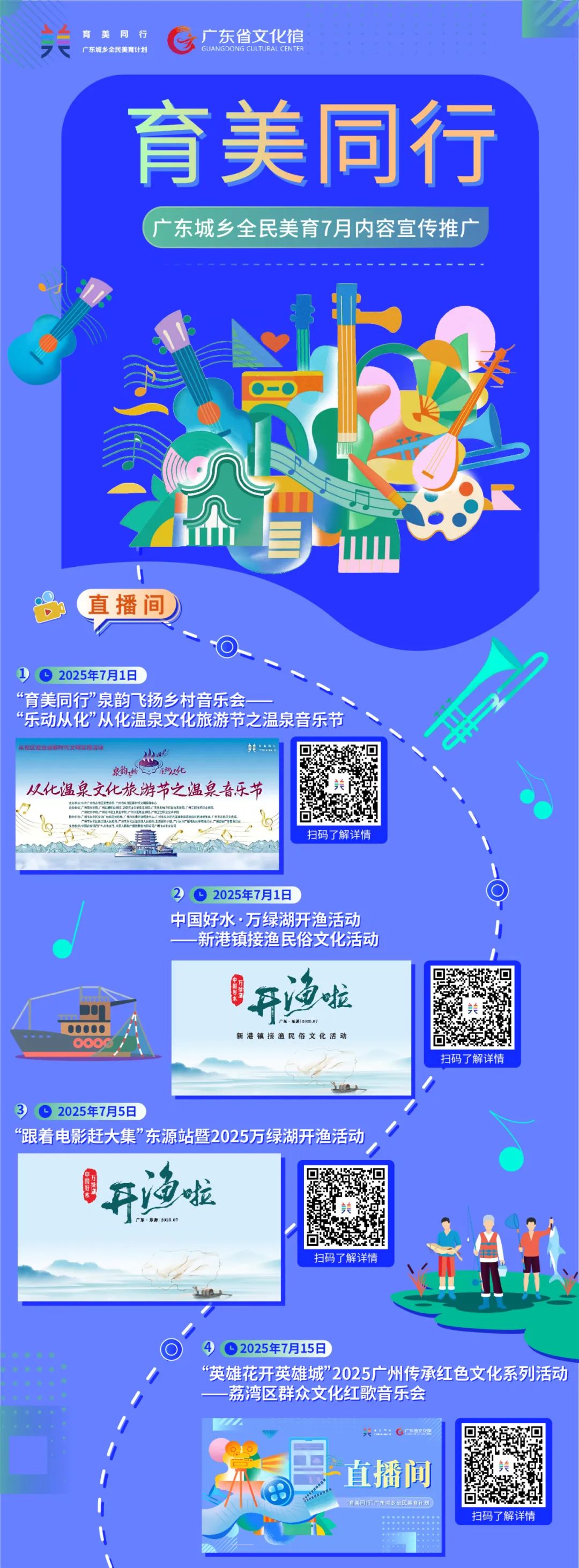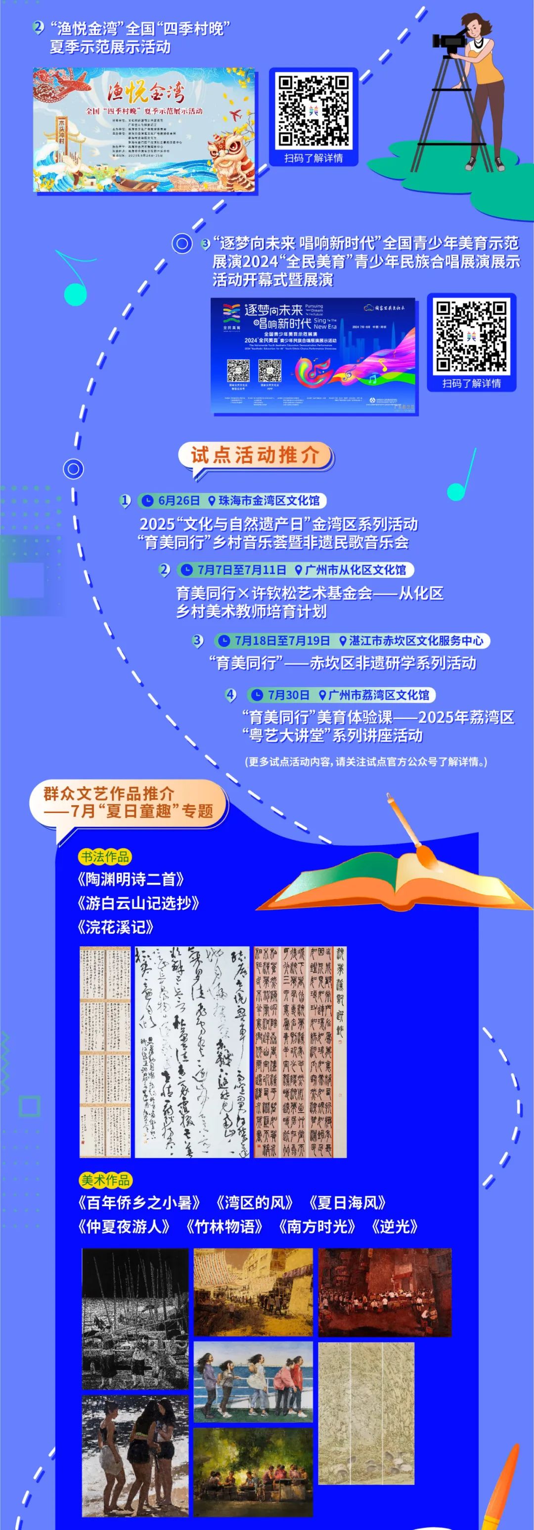 这个七月,多重精彩艺术体验清凉来袭!本月起新增“试点活动推介”专栏,将“育美同行”广东城乡全民美育计划试点(广州市荔湾区、广州市从化区、珠海市金湾区和湛江市赤坎区)的最新活动资讯一网打尽!快速点击下方长图,共同开启一场夏日艺术之旅吧!