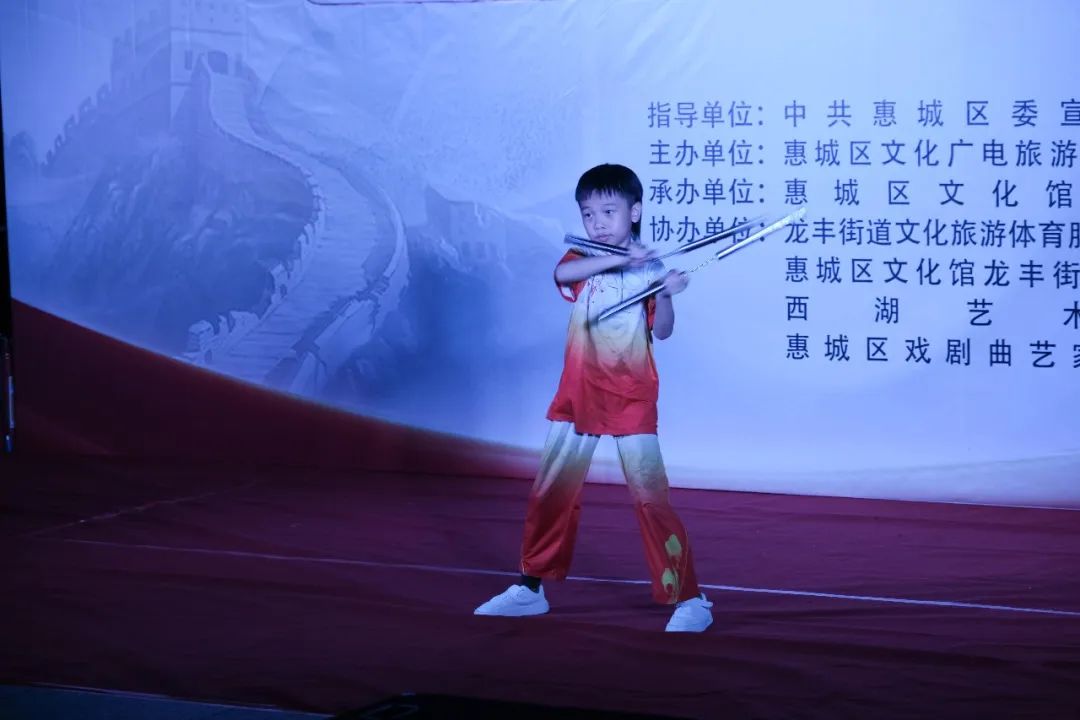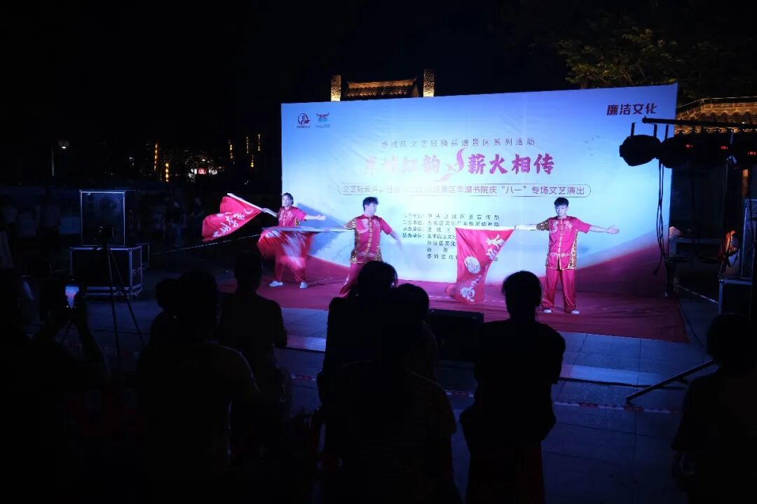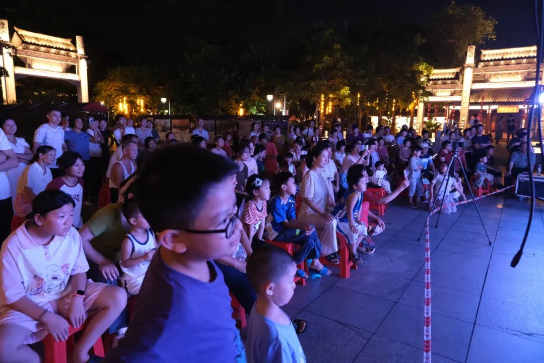 原本天气预报提示当晚有雷暴,让不少人为演出能否顺利进行捏了一把汗,没想到天公作美,临近演出时雨势渐停,天空放晴,澄澈的夜空下,丰湖书院的古建筑群在灯光映照下更显古朴庄重,为这场红色盛宴铺开了绝佳的天然幕布。开场舞《战舞》气势如虹,瞬间点燃现场氛围;民歌手张文倩的《兵哥哥》唱出了军民鱼水情,观众们跟着节奏一起打起了拍子氛围感十足;杨军萨克斯演奏的《军歌串烧》勾起峥嵘回忆,他走进人群中跟观众们一起互动非常接地气;惠州市李家拳协会的《鹅城雄风》刚劲有力,观众们喝彩声不断;木木用流行歌《如愿》、《我和我的祖国》传递家国情怀;袁州带来魔术《罗圈献彩》时,奇妙的变幻瞬间抓住全场目光,小朋友们更是欢呼雀跃,稚嫩的惊叹声此起彼伏,为现场增添了童真趣味。从独舞《鸿雁》的诗意,到双人舞《向往》的温情,最后以《不忘初心》舞蹈收尾,让观众沉浸式地感受艺术与红色文化交融的魅力。