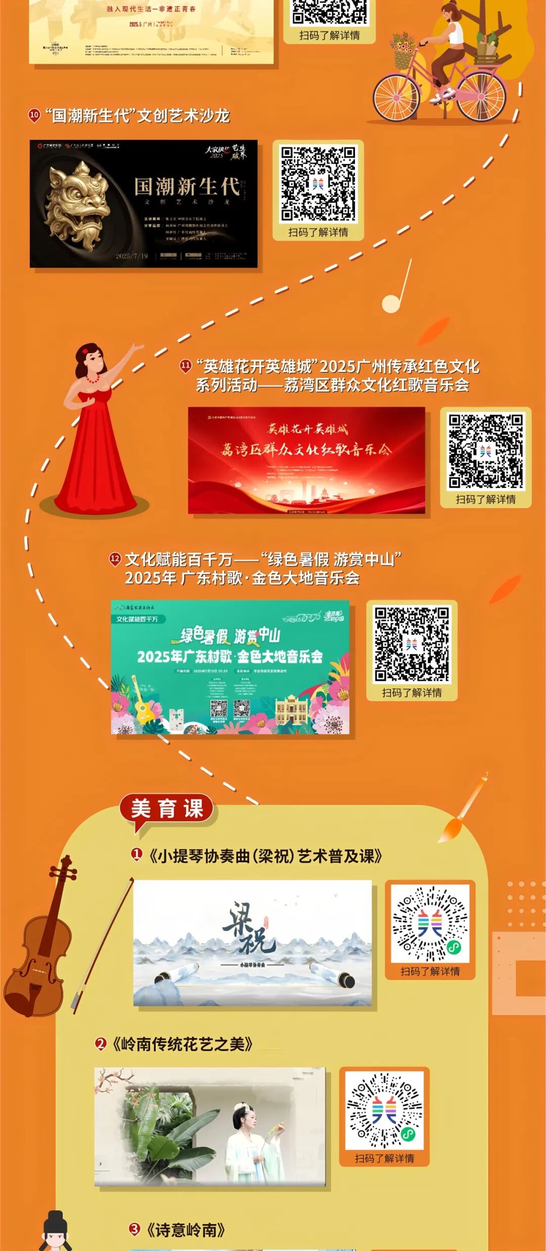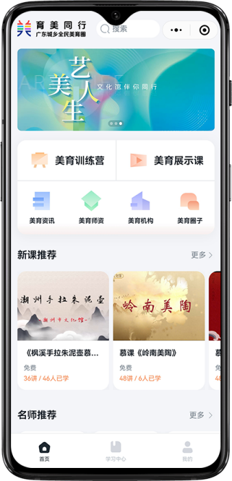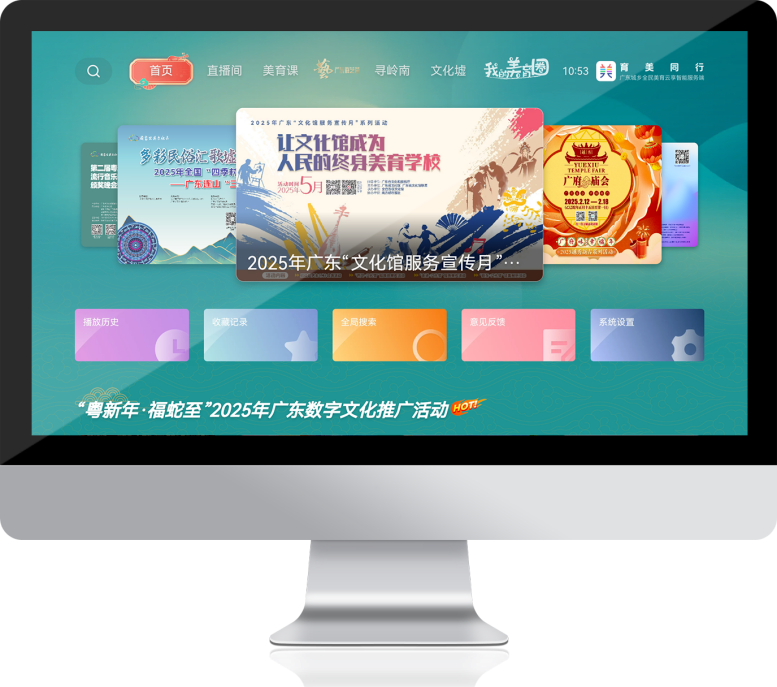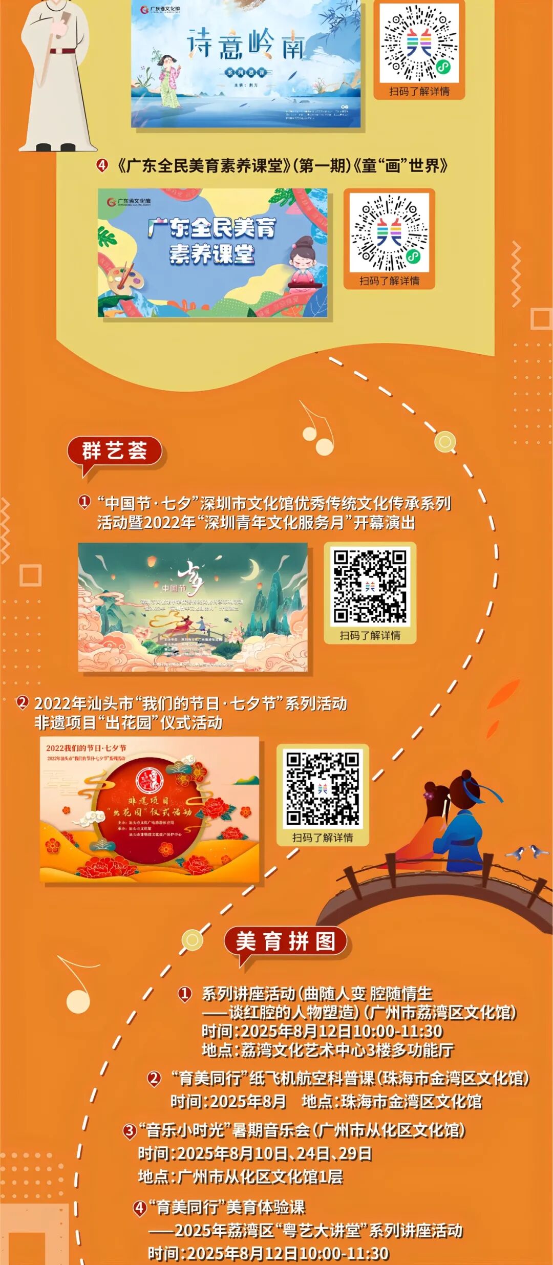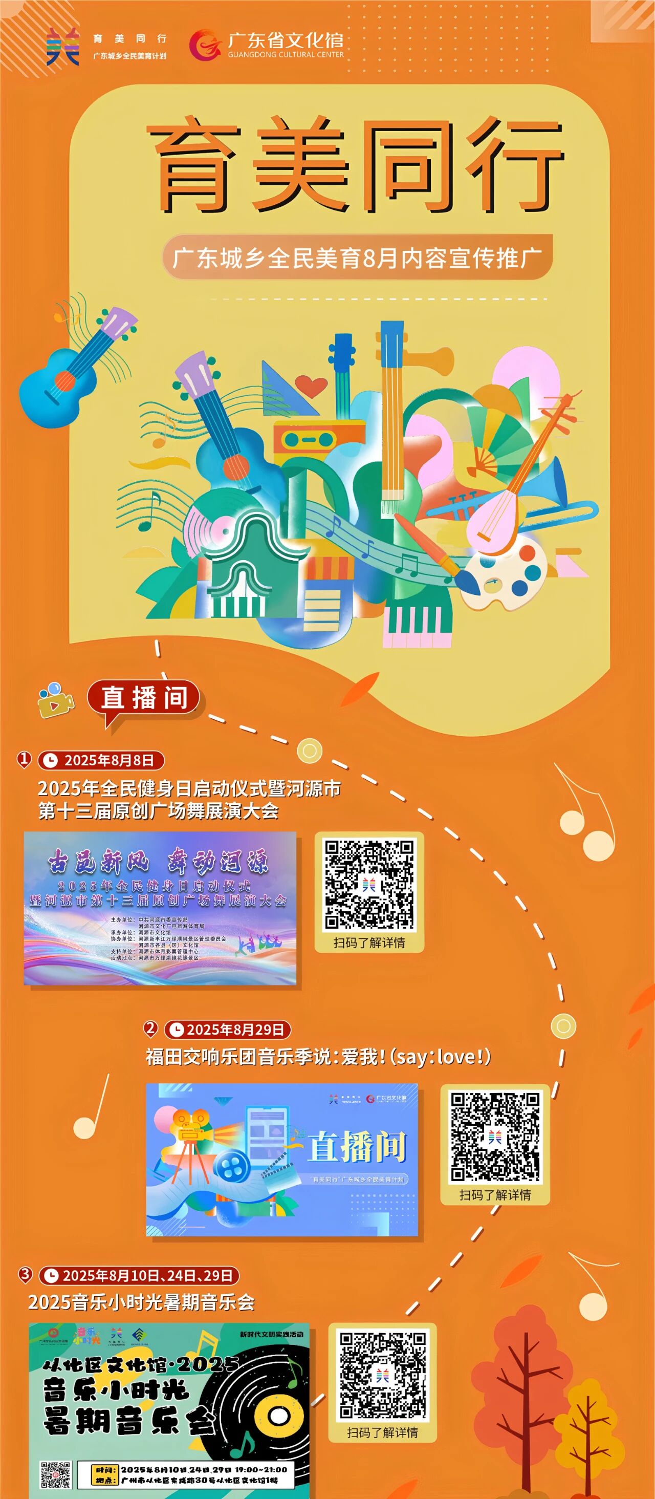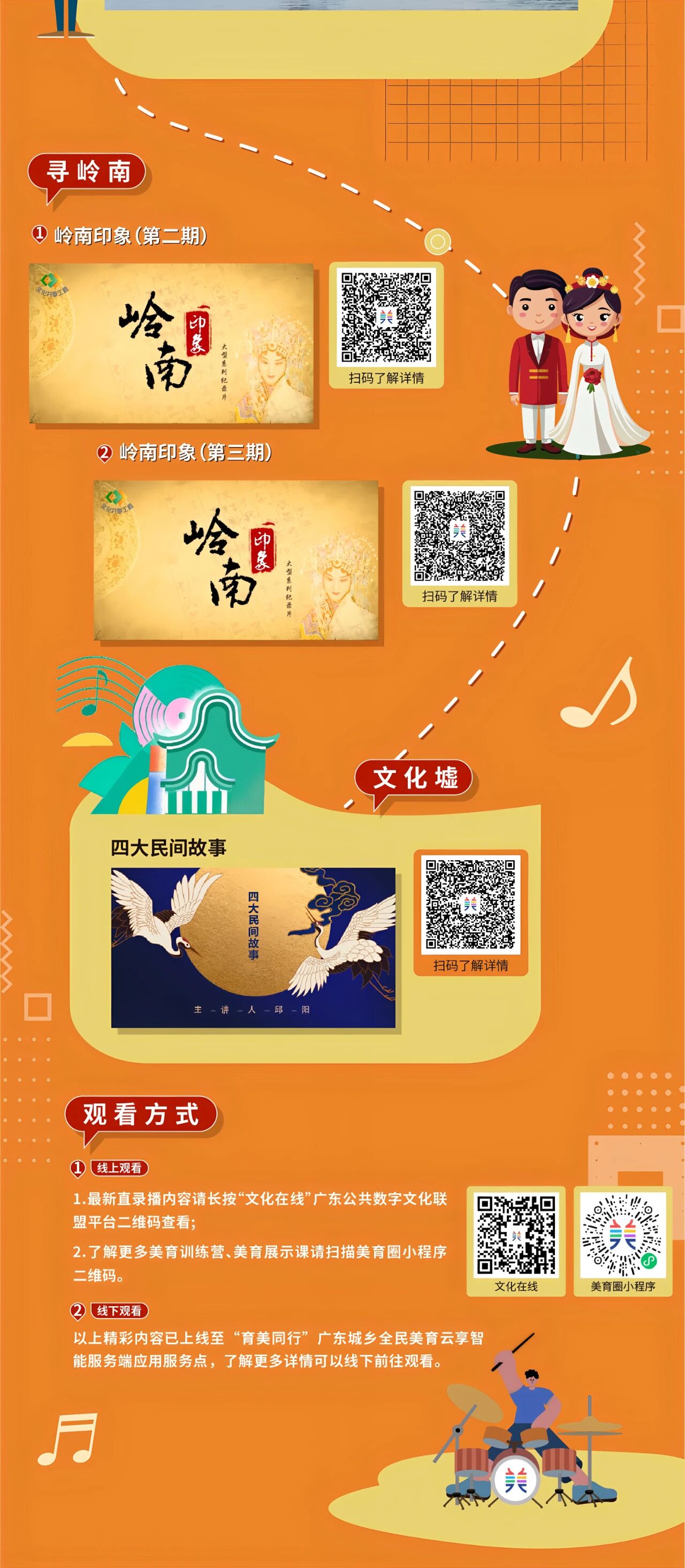 为积极构建优质文化资源直达基层的长效机制,着力推动我省全民美育工作深入开展,充分发挥文化馆“全民艺术普及”阵地作用和城乡居民终身美育学校职能,广东省文化馆、广东省文化馆联盟策划实施“育美同行”广东城乡全民美育计划,倾力打造面向文化馆(站)、社会服务点的“育美同行”广东城乡全民美育云享智能服务端,以及面向群众开展美育服务的“育美同行”广东城乡全民美育圈小程序,涵盖直播间、美育课、广东群艺荟、美育拼图、寻岭南、文化墟等多个板块,通过“线上+线下”双轨联动,实现从经典艺术普及到前沿文化体验的全场景覆盖,为观众提供一场跨越时空的艺术盛宴。