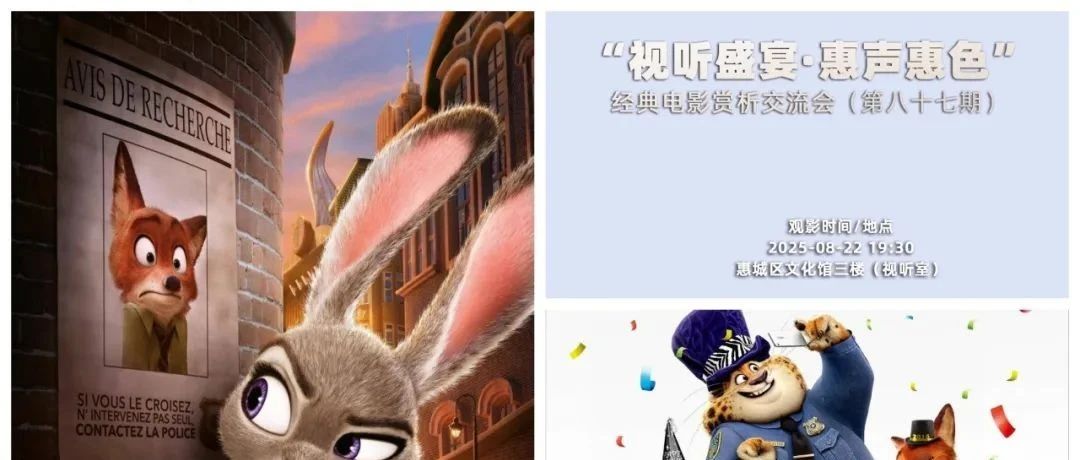 “视听盛宴·惠声惠色”经典电影赏析交流会第八十七期将于8月22日晚举行,一个让每个平凡灵魂都敢相信“无所不能”的地方《疯狂动物城》。