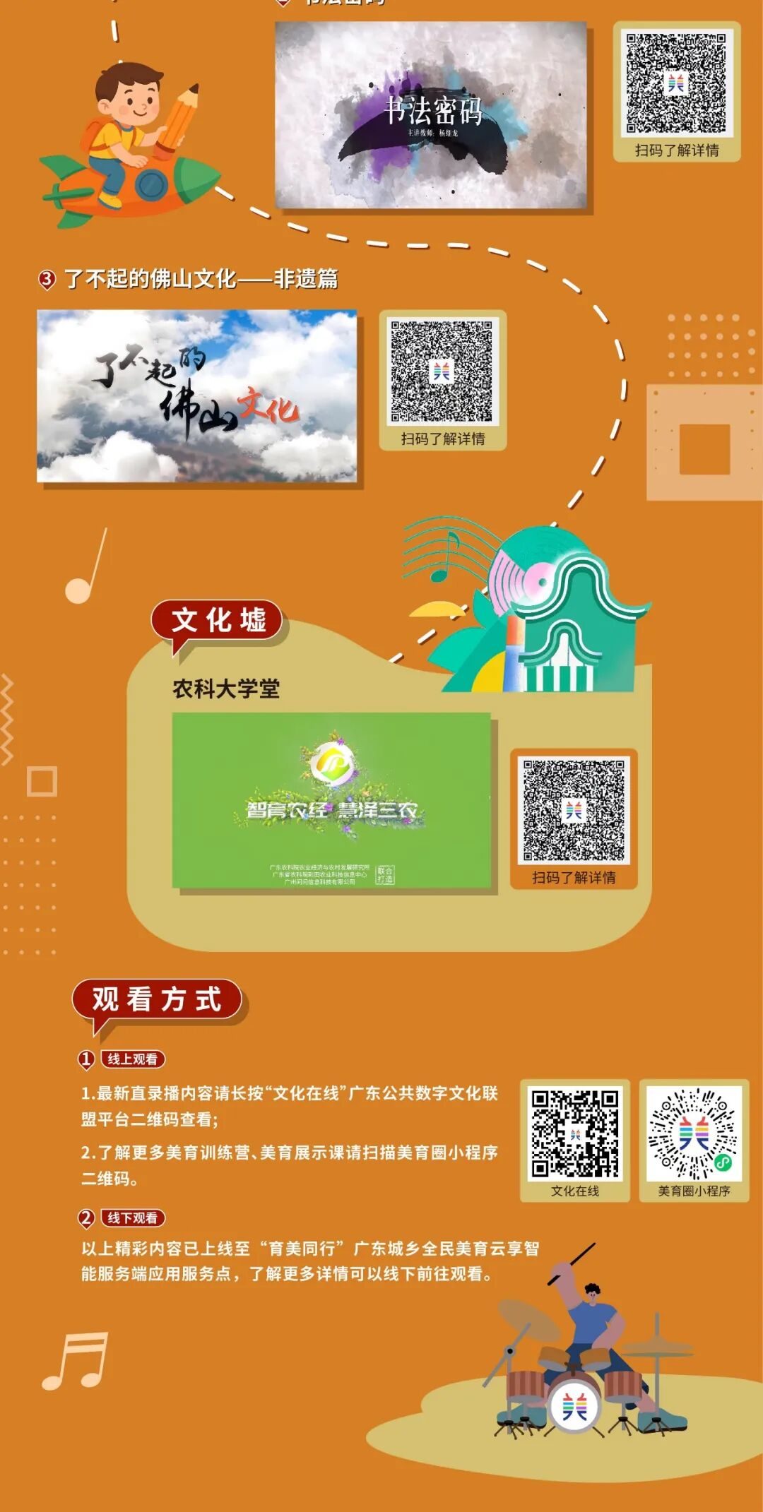 九月,充满着浓郁的书香气息,是丰收的季节,也是美育绽放的时节。为积极构建优质文化资源直达基层的长效机制,着力推动我省全民美育工作深入开展,充分发挥文化馆“全民艺术普及”阵地作用和城乡居民终身美育学校职能,广东省文化馆、广东省文化馆联盟策划实施“育美同行”广东城乡全民美育计划,倾力打造面向文化馆(站)、社会服务点的“育美同行”广东城乡全民美育云享智能服务端,以及面向群众开展美育服务的“育美同行”广东城乡全民美育圈小程序,涵盖直播间、美育课、广东群艺荟、美育拼图、寻岭南、文化墟等多个板块,以艺术滋养城乡,用美育点亮生活。