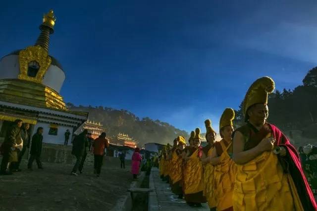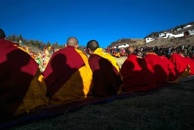 这是一场所有周边藏族人都会参加的盛会,上至老人、小孩都会穿上节日盛装,集聚在这晒佛之地,伴随着那特有的大法会的号角声,一年一度的晒佛节拉开了序幕。僧人们把寺院里珍藏的巨幅唐卡佛像“请”出来,数十人扛在肩上,由高僧前导,僧人尾随,沿着弯弯曲曲的山路来到阳光直射的晒佛台上,将唐卡佛像慢慢展开,展示于大众信徒面前,让其观瞻膜拜。当我们穿行在这盛大的巡游队伍当中,寻找最佳角度拍摄的时候,身旁每一处的藏民信徒都驻足弯腰虔诚顶礼膜拜,此情此景让人十分震撼。