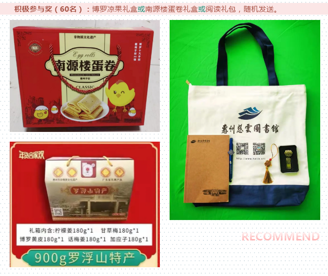 人气获赞(前120名),且内容切合活动主题的,可获得由惠州市文化馆(惠州市非物质文化遗产保护中心)、惠州慈云图书馆提供的非遗礼盒或阅读礼包一份。