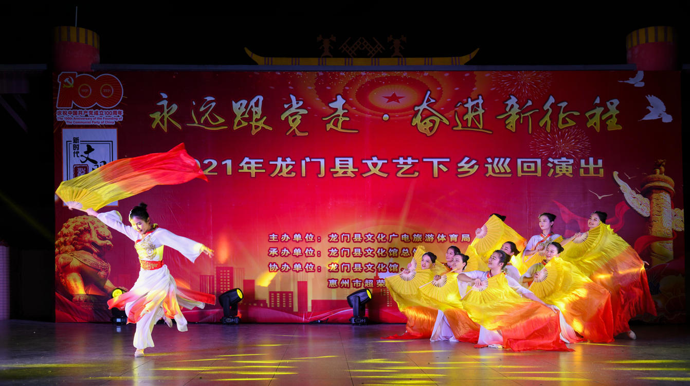 2021年10月28日至11月7日期间,由龙门县文化广电旅游体育局主办,龙门县文化馆总馆承办,龙门县文化馆、图书馆各乡镇(街道)分馆、惠州市超荣文化艺术发展有限公司协办的“永远跟党走·奋进新征程”2021年龙门县文艺下乡巡回演出,走进了龙门县辖区内平陵、龙华、地派等11个乡镇(街道)共有8000多人次观看了此次演出,文艺演出活动受到当地群众的热烈欢迎和一致好评。