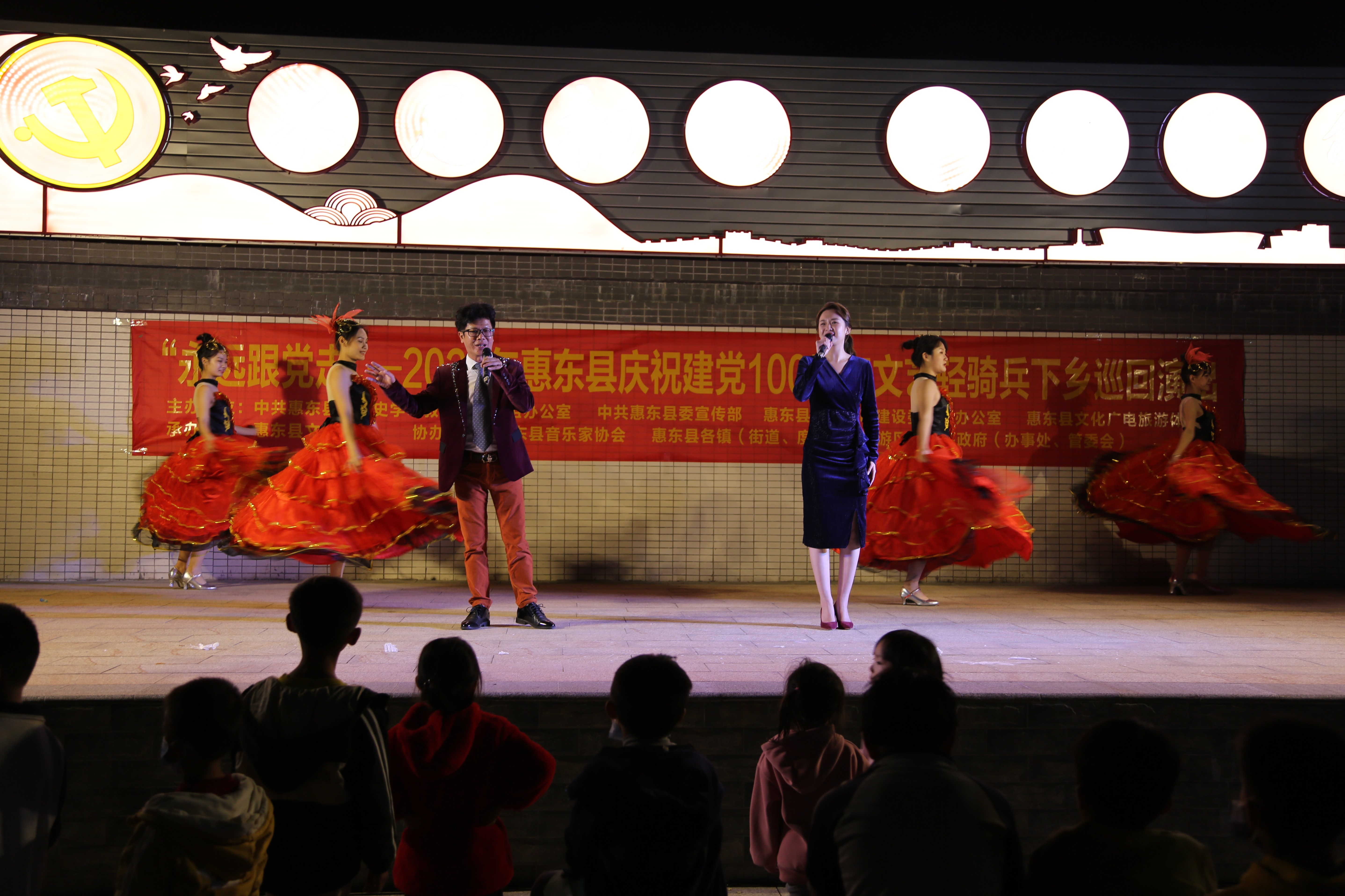 为庆祝中国共产党成立100周年,全面贯彻落实党的十九大精神和习近平新时代中国特色社会主义思想,进一步激发全县人民的爱国、爱党热情,引导广大群众继承和弘扬爱国主义光荣传统,坚定跟党走中国特色社会主义道路的理想信念。11月11日,由惠东县委宣传部、县文广旅体局、县文明办主办,县文化馆承办、县音协协办主题为“永远跟党走”2021年惠东县庆祝建党100周年文艺轻骑兵下乡巡回演出(白盆珠站)分别在白盆珠中心小学和白盆珠文化广场举行,演员们用饱满的热情给观众们带来了一场视听盛宴。