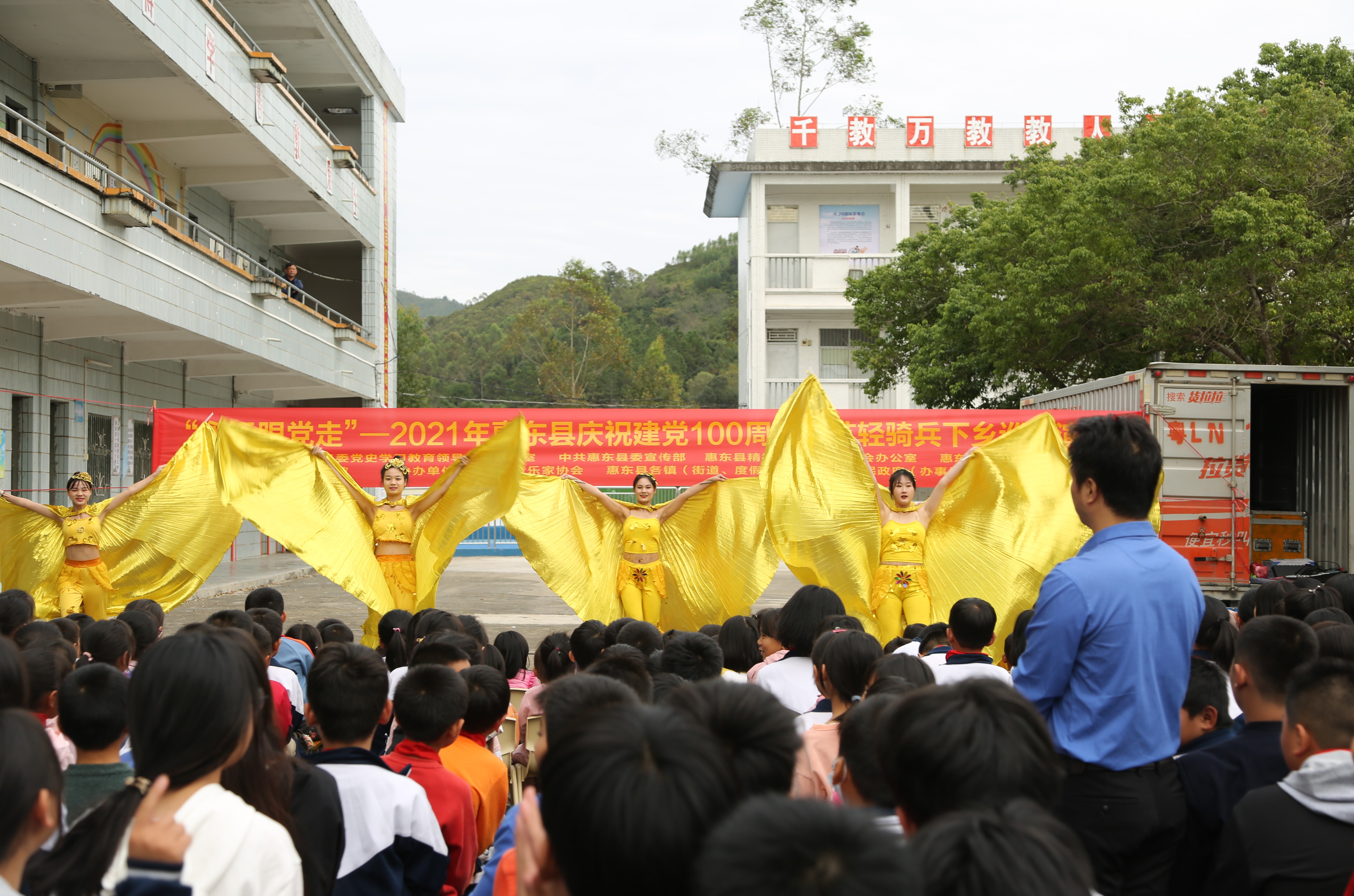 为庆祝中国共产党成立100周年,全面贯彻落实党的十九大精神和习近平新时代中国特色社会主义思想,进一步激发全县人民的爱国、爱党热情,引导广大群众继承和弘扬爱国主义光荣传统,坚定跟党走中国特色社会主义道路的理想信念。11月12日,由惠东县委宣传部、县文广旅体局、县文明办主办,县文化馆承办、县音协协办主题为“永远跟党走”2021年惠东县庆祝建党100周年文艺轻骑兵下乡巡回演出(多祝站)分别在松坑小学和多祝文化广场举行,演员们用饱满的热情给观众们带来了一场视听盛宴。