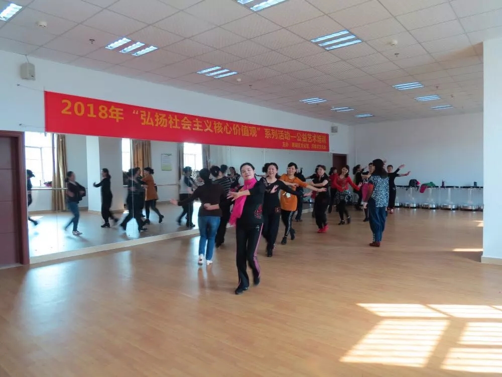 3月12日上午,2018年"弘扬社会主义核心价值观"系列活动公益艺术培训班正式开班了!为深入推进公共文化体系建设,进一步提升辖区免费开放服务质量水平,满足广大群众文化需求,由惠城区文化馆、河南岸文化站联合主办的"弘扬社会主义核心价值观"系列活动公益艺术培训在河南岸街道文化站如火如荼的开展,20多位舞蹈文艺骨干参加了本次培训。