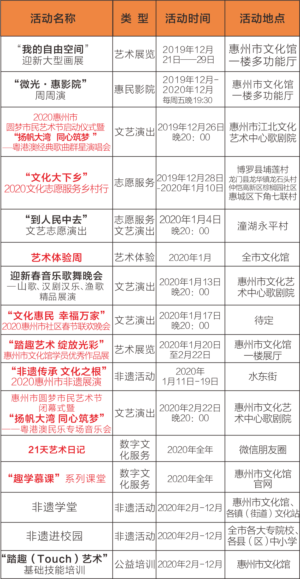 在2020年春节期间,全市文化馆人期待您和您的家人朋友,走进身边的文化馆接触艺术,或者拿出手机关注“惠州市文化馆”官微参与我们的各类艺术活动,一起感受关于艺术,关于生活,关于爱和美好!